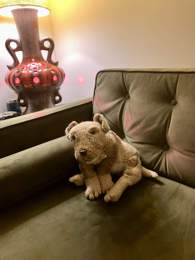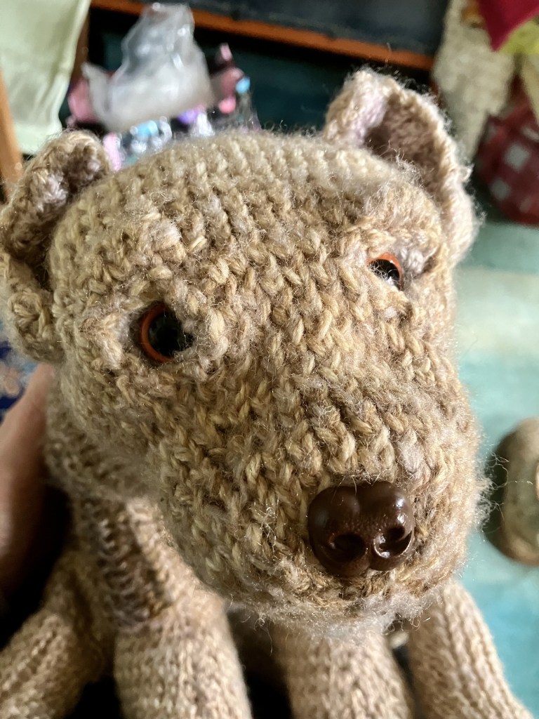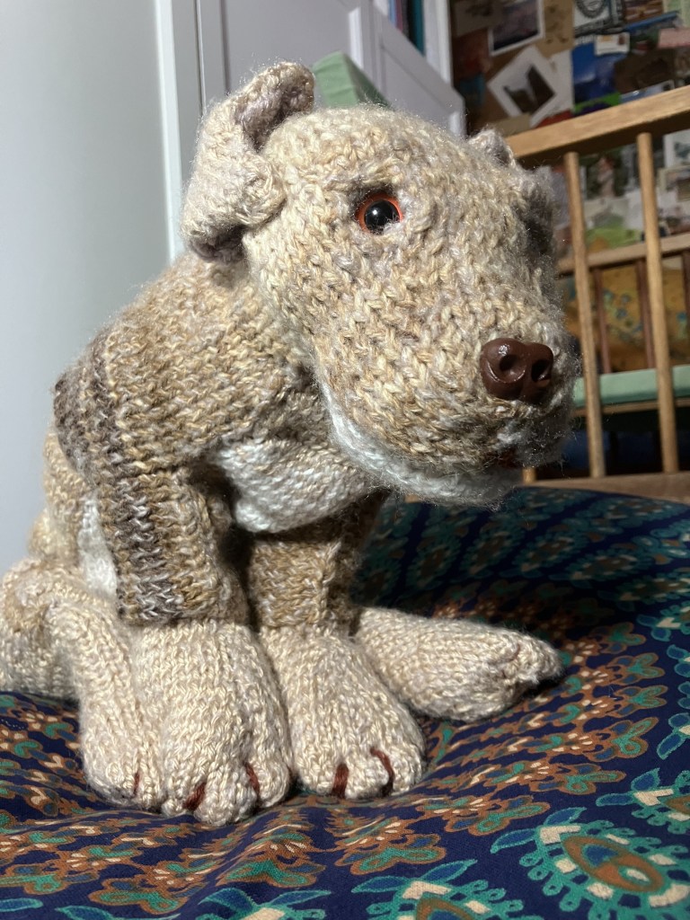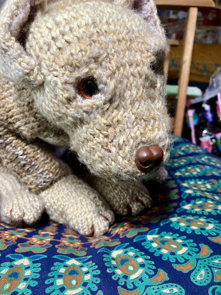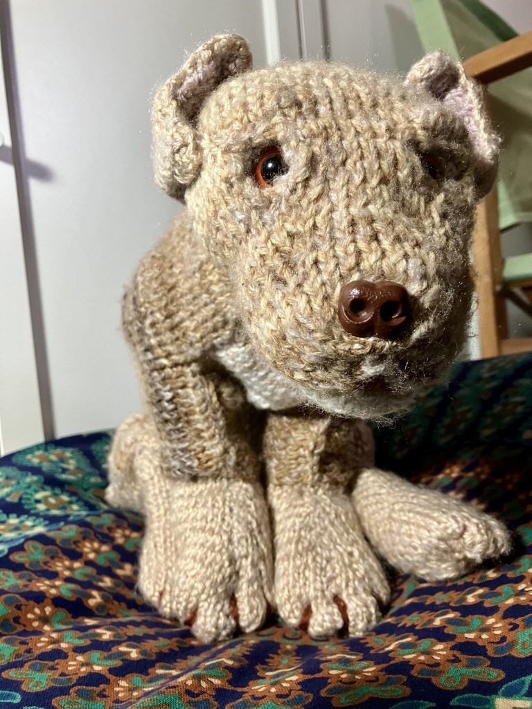 I was forced to stop for a bit because of a horrible cold. I finally had time to just sit and knit. So here he is my knitted puppy, he’s been christened Milo. How long before my daughter steals him?