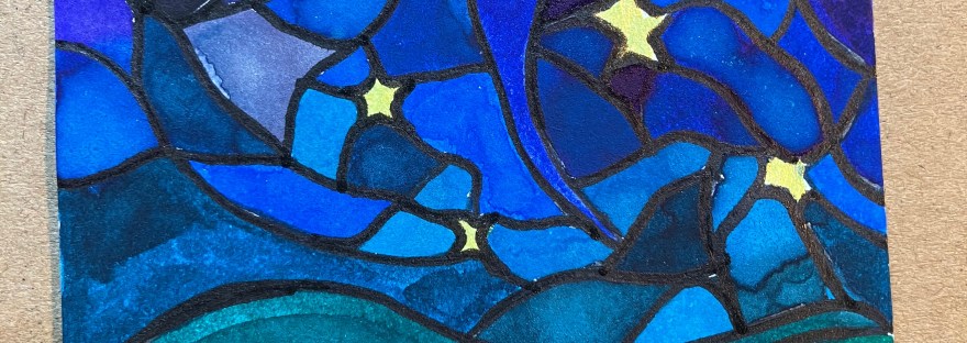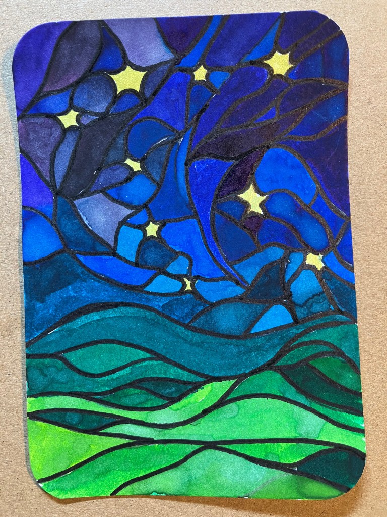 Instead, I’ve been thinking about the night sky itself: deep blues and indigos, fractured and held together like a stained glass window. Small stars glow quietly between the dark shapes, not demanding attention, just present. The lower half of the card shifts into greens — land beneath sky — a reminder of being held by the earth even when everything above feels vast and unknown.