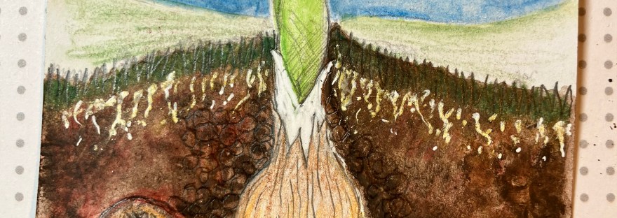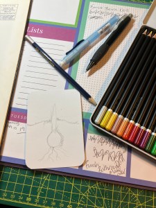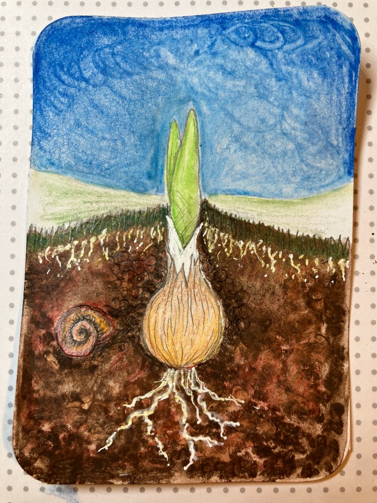 I sketched the bulb first, thinking about how everything it needs is already there, held safely inside. The roots, the shoot, the future flower — all present, even now. I worked the final card using watercolour pencils, building earthy layers in the soil and softer blues in the sky, then added white pen to pick out roots, frost, and small points of light.