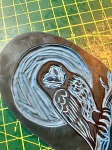 The image was carved as a simple lino print, focusing on shape and contrast rather than detail. The moon becomes both a source of light and a space of containment, holding the owl in a moment of watchful calm.