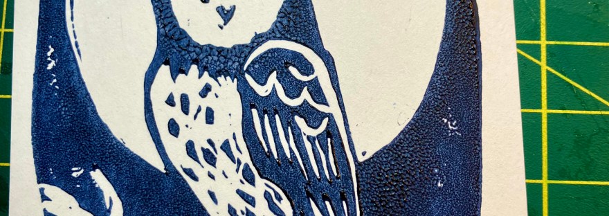 The image was carved as a simple lino print, focusing on shape and contrast rather than detail. The moon becomes both a source of light and a space of containment, holding the owl in a moment of watchful calm.