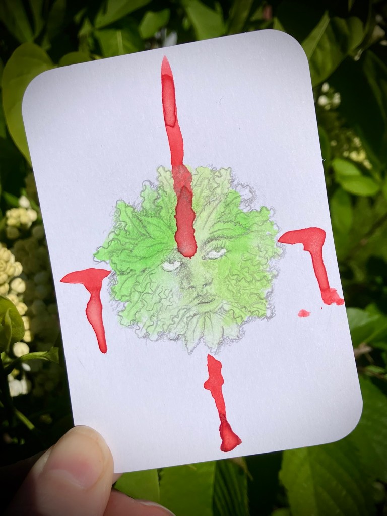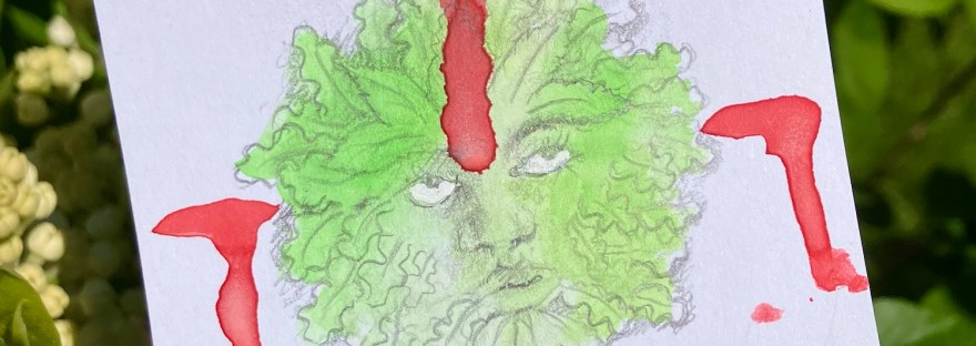 I had planned to make something for St George’s Day, but when I sat down to work, it shifted. The Green Man stayed, but the red cross didn’t sit quietly behind him—it bled.